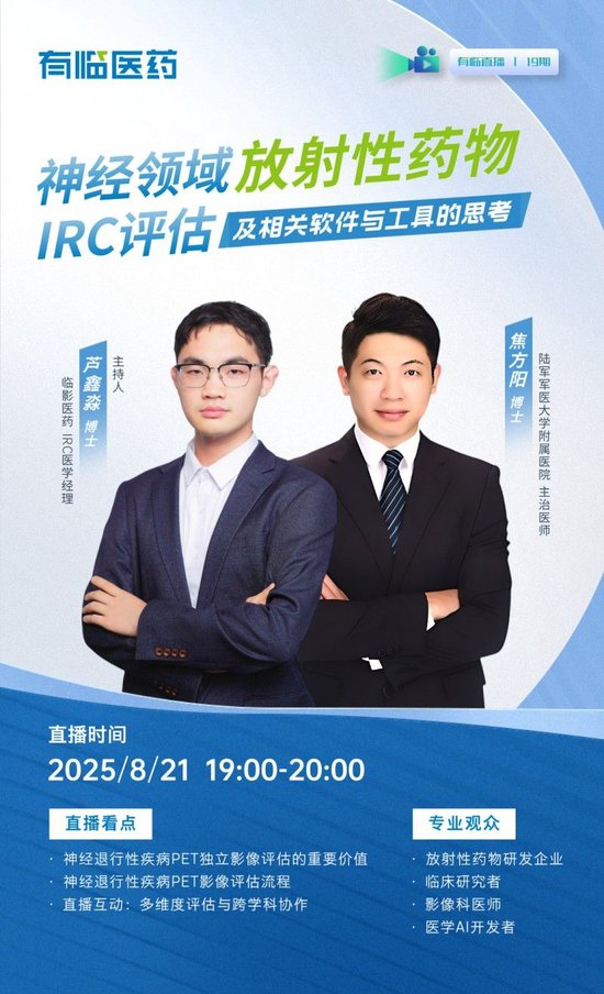 8月21日(周四)19:00,欢迎锁定有临医药直播间——主持人临影医药医学经理芦鑫淼博士,将邀请复旦大学博士、陆军军医大学附属医院主治医师焦方阳博士,共探神经领域放射性药物影像评估的标准化、自动化与智能化前沿。