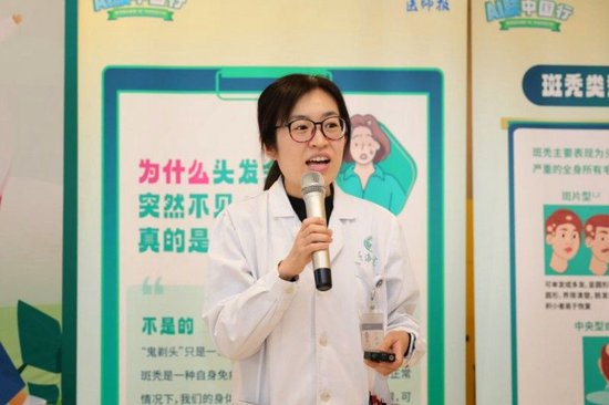 同为主讲专家的上海长海医院皮肤科主治医师薛燕,则聚焦于讲解脱发问题,帮助大家鉴别斑秃与雄秃的区别,雄激素性脱发是一种具有遗传倾向的多基因隐性遗传疾病,而斑秃是由遗传因素与环境因素共同作用所致的毛囊特异性自身免疫性疾病。专家通俗易懂的科普方式,让市民们对“头上的烦恼”有了更科学的认知。