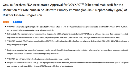 11月26日,大冢制药宣布Sibeprenlimab(斯贝利单抗)获得FDA加速批准上市,用于治疗有疾病进展风险的原发性免疫球蛋白A肾病(IgAN),以减少蛋白尿。
