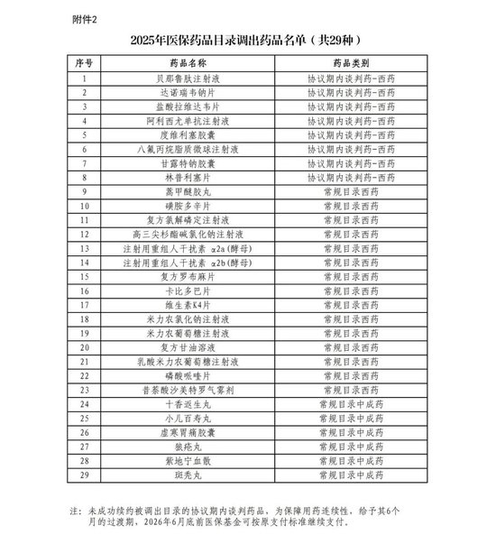 为保障参保人用药连续性,国家医保局设置过渡期政策,此次调整中未成功续约被调出目录的协议期内谈判药品有6个月的过渡期,2026年6月底前,参保人购买这些药品,仍然可按照原报销标准。